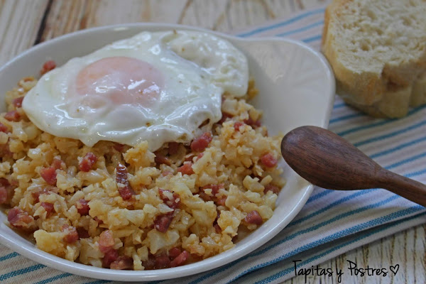 APARTE PONEMOS UNO O DOS DIENTES DE AJO LAMINADO A LA PLANCHA LA PLANCHA PINTADA DE ACEITE O NADA Y AGREGAMOS LOS TACOS DE JAMON Y EL BACON EN TIRAS CON ESE JUGO SIN ACEITE SE COCINA CUANDO ESTE MEZCLAMOS CON LA COLIFLOR RAYADA Y COCINADA Y DAMOS UNAS VUELTAS QUE SE MEZCLEN SABORES SERVIR CALIENTE NO SABE A PAN PERO TAMPOCO A COLIFLOR OS VA A ENCANTAR
