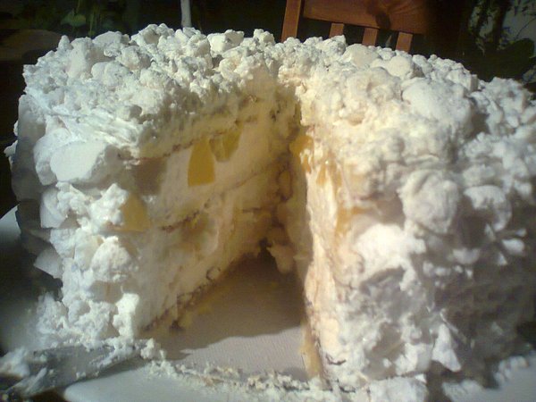 Despues, se monta la torta cortando el bizcochuelo en dos partes. Mojamos con almibar de duraznos la capa de bizcochuelo, le ponemos una capa muy fina de crema de leche batida y endulzada. Sobre la crema, colocamos uno de los discos de merengues. Sobre este disco, colocamos duraznos en almibar bien picados. Luego, añadimos la otra capa de bizcochuelo, también húmedo con almibar de duraznos.