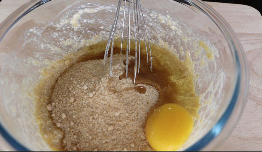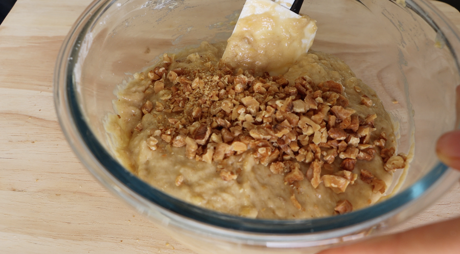1. Chafar los plátanos con un tenedor. Añadir la mantequilla blanda y la sal. Mezcla. Agregue la vainilla, el huevo, el azúcar y mezcle.