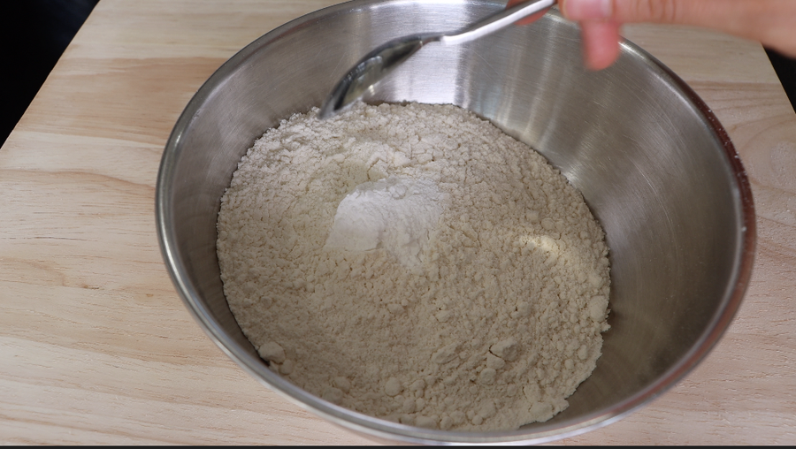 2. Mezclar la harina con el polvo de hornear. Añadir a los ingredientes líquidos y mezclar.