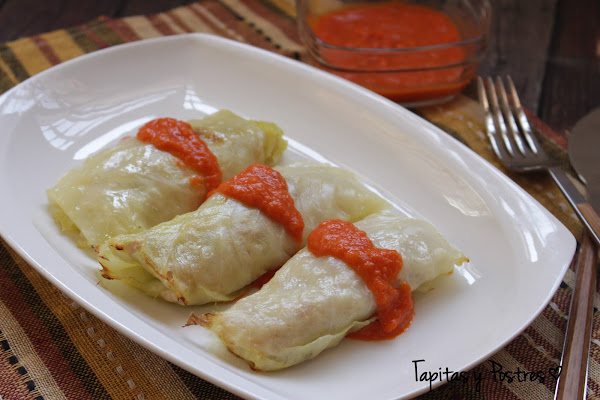 Hojas de col carne picada de cerdo y ternera 250 gr. cebolla 1 harina huevo tomate frito sal pimientaHervir las hojas de col en agua y sal durante 10 o 12 minutos escurrir y poner en agua fria durante unos minutos, después, colocarlas en un paño para que se sequen un poco y reservar. Sofreir la cebolla bien picada para luego añadirle la carne salpimentada, rehogar y, si se quiere, ponerle un poco de tomate. Procederemos a rellenar las hojas de col haciendo unos paquetitos. Ponemos el relleno en el centro de la hoja e iremos envolviendo como si fuera un paquete, luego los pasamos por harina y huevo para freirlos en aceite caliente, después los colocamos en una cazuela donde habremos puesto el tomate frito, dejamos unos 5 minutos y servimos bien calientes.