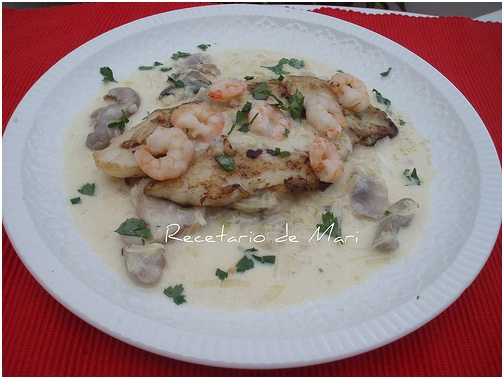 Servimos poniendo la salsa en el fondo del plato, encima el pescado, adornamos y picamos un poquito de perejil.