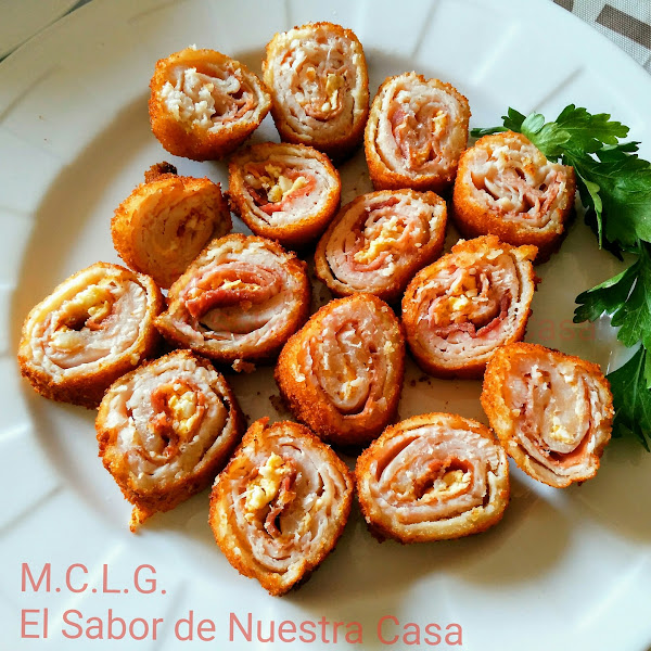 Aunque el jamón serrano es el relleno más clásico, el flamenquín admite otros ingredientes además del jamón, como huevo cocido, pimiento rojo en tiras (de lata), unas tiras de queso... y con todas las combinaciones estará muy sabroso.