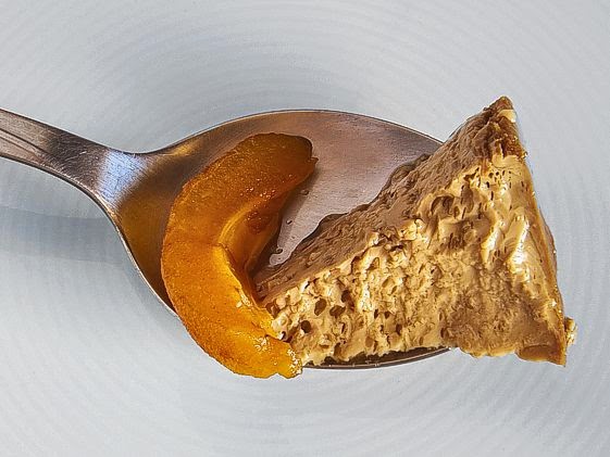 - Desmoldamos los flanes y servimos acompañados de los gajos de níspero y bañados con el brandi de haberlos confitado.