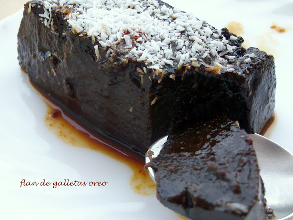 !!! FLAN CON GALLETAS OREO ¡¡¡ INGREDIENTES !!!¡¡¡!!!¡¡¡!!!¡¡¡!!! 800 ml de leche ( 2oo ml x 4 veces ) los 200 ml es para hacer el flan 4 veces 264 gr. de flan royal ( 66 gr. para hacerlo 4 veces ) 15 galletas oreo rellenas un poco de colorante para el flan ELABORACIÓN !!!¡¡¡!!!¡¡¡!!!¡¡¡!!! Ponemos en un cazo 200 de leche junto con los polvos del flan y movemos hasta que estén bien diluidos, lo ponemos al fuego y cuando hierba apartamos , en un molde ponemos esta crema y metemos en la nevera hasta que enfríe , trituramos las galletas hasta que estén pulverizadas, sacamos el flan de la nevera y le ponemos encima una capa de las galletas trituradas, volvemos a hacer otro flan y con mucho cuidado ponemos otra capa de flan echándolo con una cuchara , volvemos a meter en la nevera así hasta las cuatro veces,se desmolda cuando haya enfriado muy bi