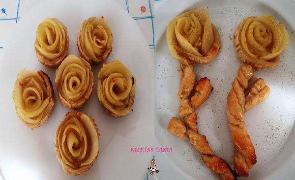UnasriquísimasRosas de Hojaldre y Manzana para empezar la semana!!! ^_^Feliz Semana Santa a tod@s!!! :DIngredientes:1 Masa de hojaldre1 ManzanaAzúcarCanelaMermelada de melocotónLimónAgua Preparacion:Ponemos un caldero al fuego con agua y un chorrito de limón, pelamos la manzana y cortamos unos gajos finitos. Cuando empiece el agua a hervir añadimos los gajos de manzana y dejamos unos 3 min,lo pone ...