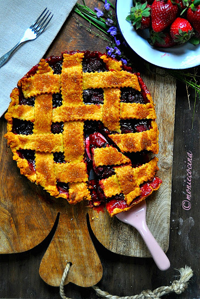 Llevar al horno hasta que el relleno comience a burbujear y la masa esté dorada. Retirar y dejar reposar sobre una rejilla mínimo una hora. Mientras más tiempo se espere, más espesarán los jugos de las fresas y será más sencillo cortar las porciones.