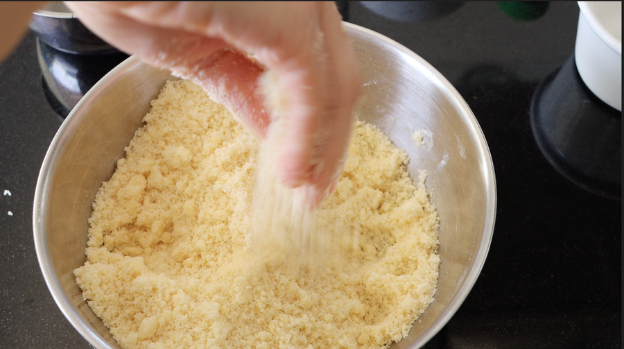 Streisel: Azúcar 150 g. Harina 120 g. Mantequilla 50 g