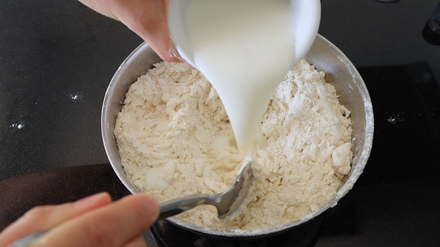 2. Mezclar la harina con la sal y la levadura en polvo. Ralle la mantequilla congelada en harina en un rallador grueso. Revuelva la mantequilla con la harina. Agregue un poco de kéfir frío, amasando gradualmente la masa. Dividir la masa en 6 partes y meter en el frigorífico durante 30 minutos.