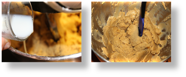 Una vez integrados los ingredientes añade en dos veces la leche y continúa batiendo hasta que se integre a la mezcla. Quedará una pasta un poco pegajosa.