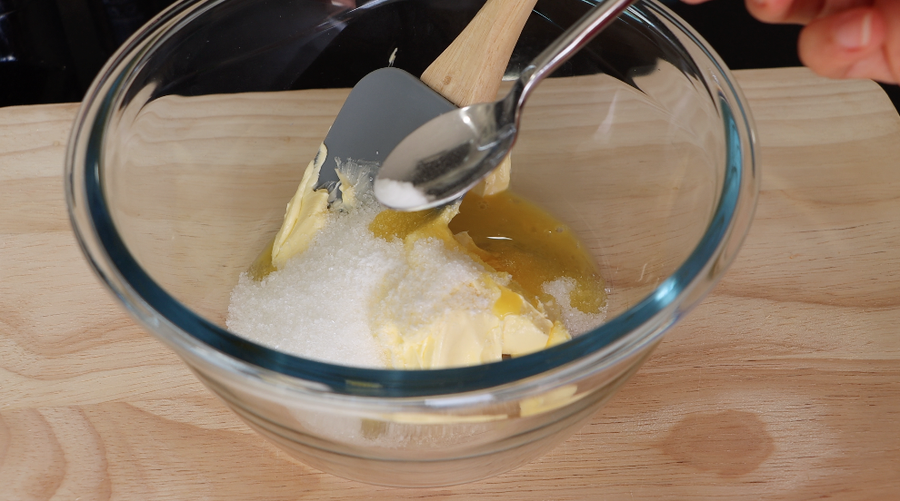 1. Mezclar la mantequilla blanda, azúcar, sal, vainilla , huevo y yogur griego.