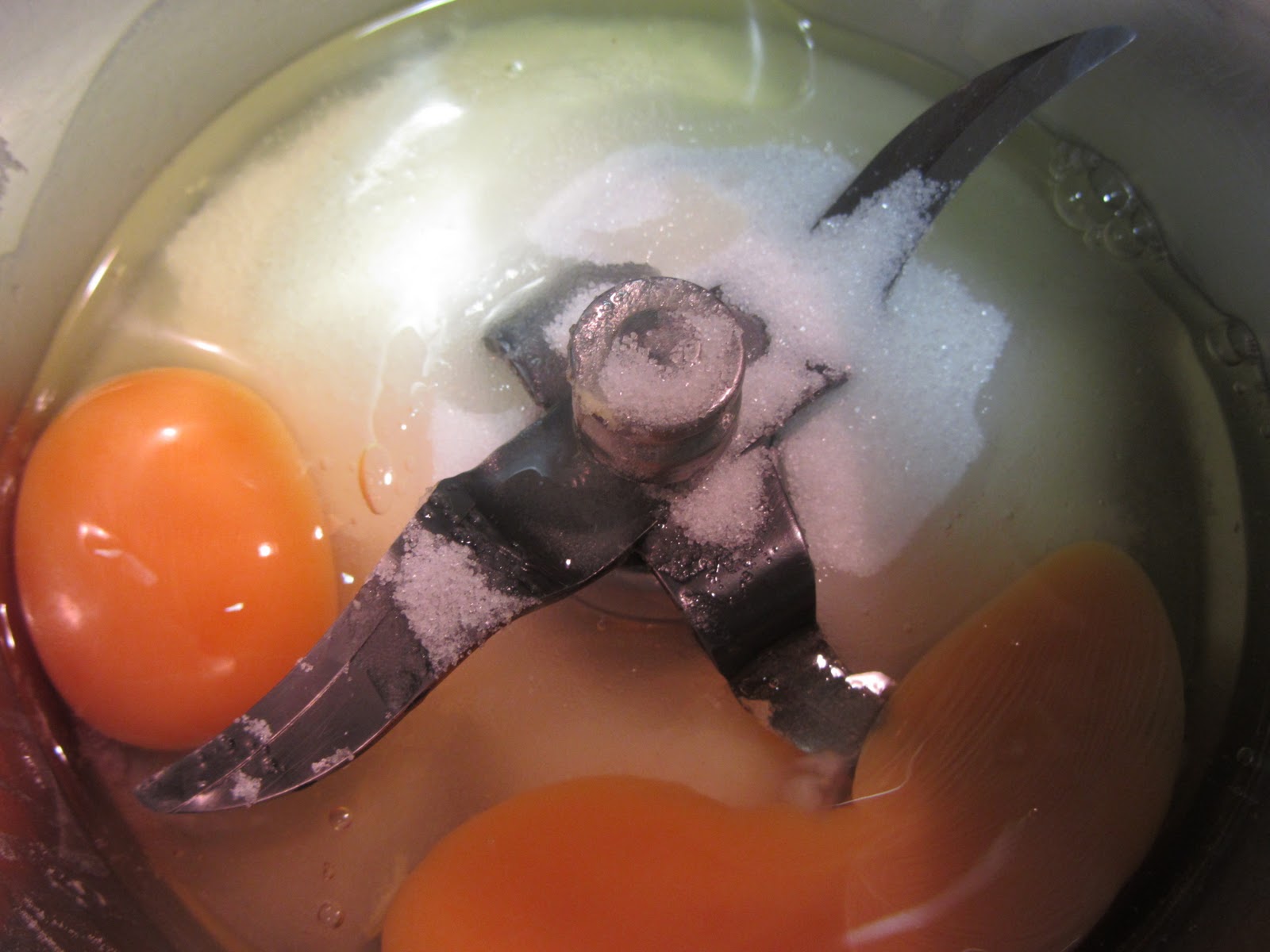 Por otro lado, ponemos en el vaso de la Thermomix el azúcar y los huevos. Colocamos la mariposa en las cuchillas, y programamos 6 minutos a velocidad 3.