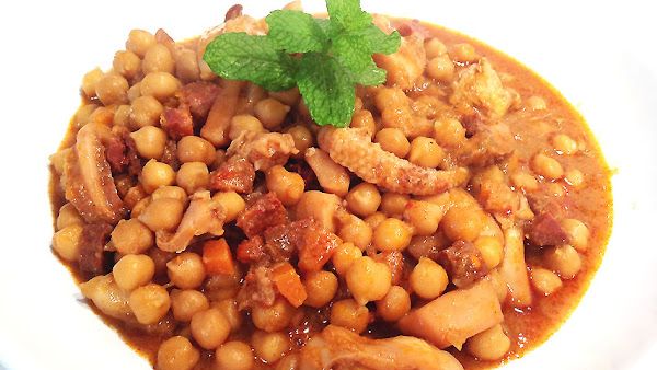 Típico de Cádiz y parte del extranjeroIngredientes (para 10 personas):Sepia (1,8 kg)Garbanzos (800 gr)Chorizo ibérico curado (150 gr)Cebolla (2)Ajo (4)Zanahoria (1)Tomate (1)Laurel (2 hojas)Pimienta negra (10-12 granos)Clavo (2)Pimentón picante (1 cucharada sopera)Canela en polvo (1 cucharadita)Comino en polvo (1 cucharadita)Jengibre en polvo (1 cucharadita)Hierbabuena frescaSalsa americana, caldo ...
