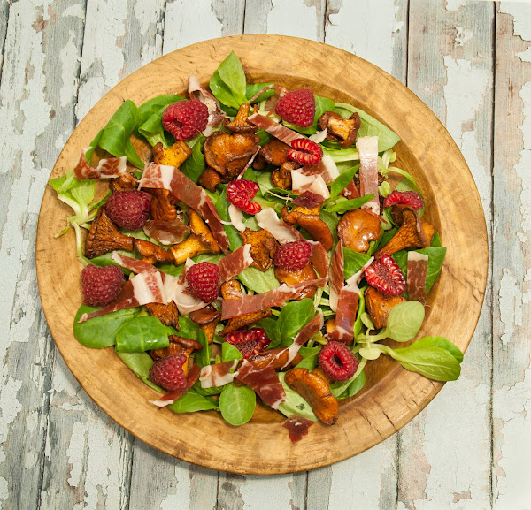 Estamos de nuevo en plena temporada de rebozuelos y como esta vez no tenía demasiados se me ocurrió estirarlos preparando una ensalada con ellos. Sorprendentemente para mi, la frambuesa con su punto ácido combina muy bien con el dulzor de los rebozuelos y ese punto graso delicioso del jamón ibérico, tenéis que probar esta combinación...Ingredientes para dos personas:- 2 puñados de canónigos.- 20 f ...
