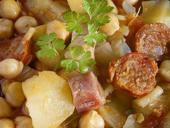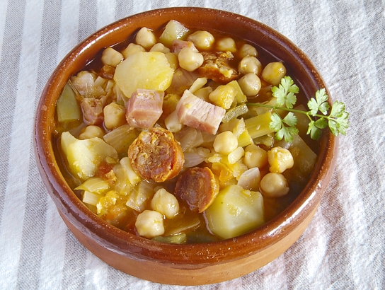 Esto sí que son palabras mayores. Vamos a empezar la temporada de guisos con un plato contundente, digno de las mejores cocinas: terror de los cuentacalorías y solaz de paladares generosos, de esos que aceptan los sabores recios y los disfrutan sin remordimientos. Y la verdad es que, bien hecho, este guiso tampoco es que sea excesivamente calórico: basta con pasar previamente por la sartén (sin aceite) los dados de panceta y de hervir aparte unos minutos las rodajas de chorizo para que una y otro pierdan parte de sus grasas. Y es así de fácil: