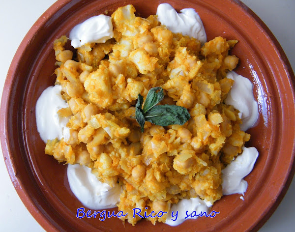 Un sencillo plato vegetariano lleno de proteínas, vitaminas y minerales gracias a los garbanzos acompañados de calabaza y coliflor. Lo hemos comido con refrescante yogur griego. Para 2-3:200 g de garbanzos cocidos y escurridos400 g de calabazaUnos ramitos de coliflor1 cebolla1 puñado de almendras crudas2 cucharadas de curry en polvo2 rodajitas de jengibre fresco2 dientes de ajo1 cucharadita de com ...