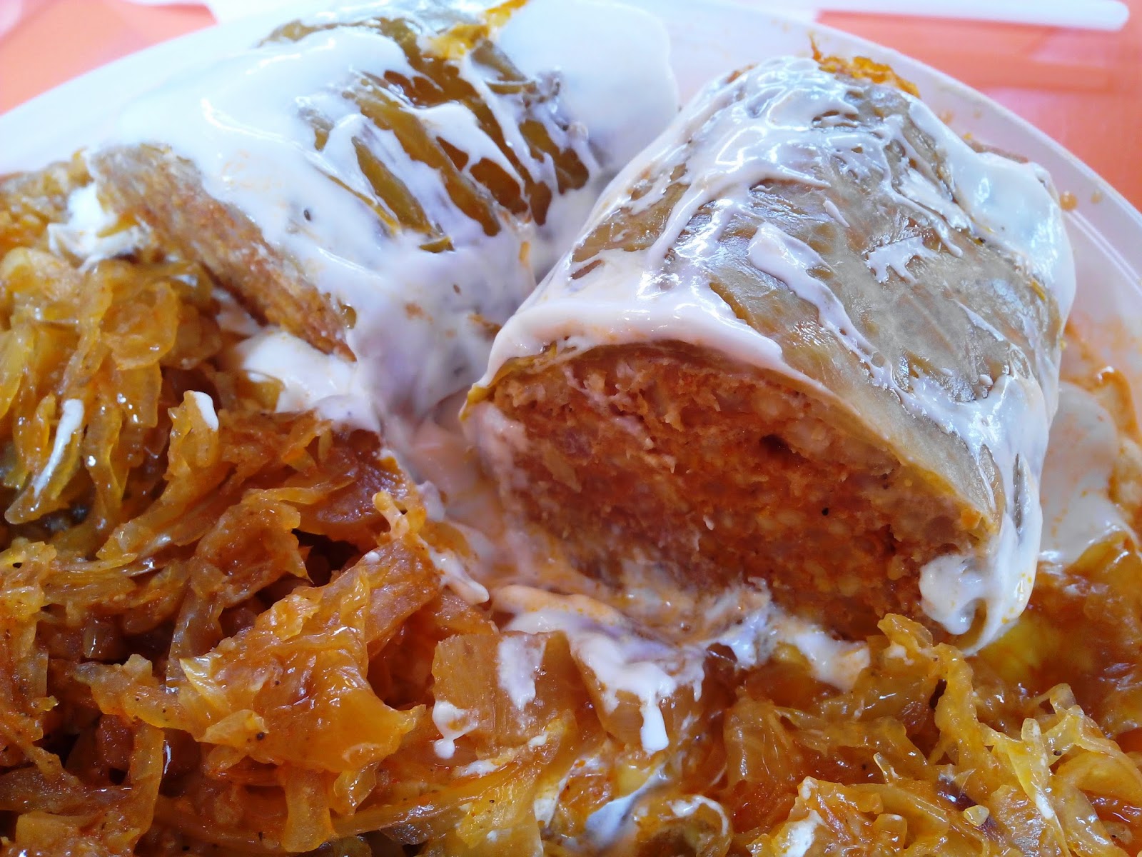 Hoja de repollo rellena de carne picada con arroz y por supuesto con paprika. Se acompaña de chucrut y se sirve con crema agria para suavizar el sabor.