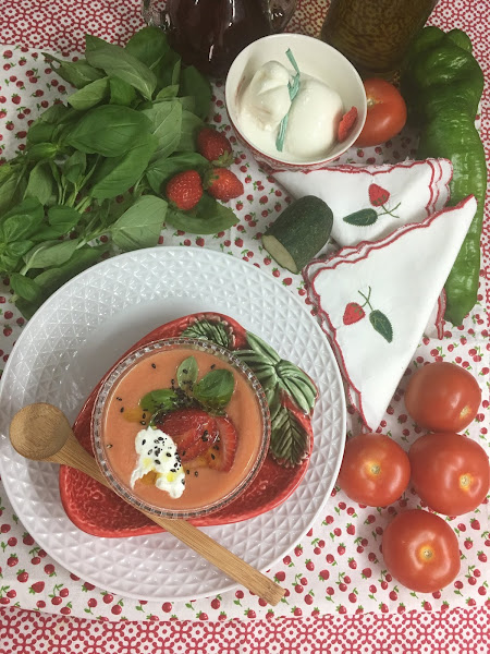 Hoy te enseño a preparar un delicioso gazpacho de fresas, un gazpacho fácil y rápido de preparar, fresco y saludable, que más podemos pedir.Ideal para estos días de calor en los que puedes aprovechar la temporada de fresas de una manera distinta y original.INGREDIENTES: para 4 personas- 1 kg de tomates rama maduros- 220 grs de fresas- 40 grs de cebolleta fresca- 1 punta de pimiento verde- 90 grs d ...