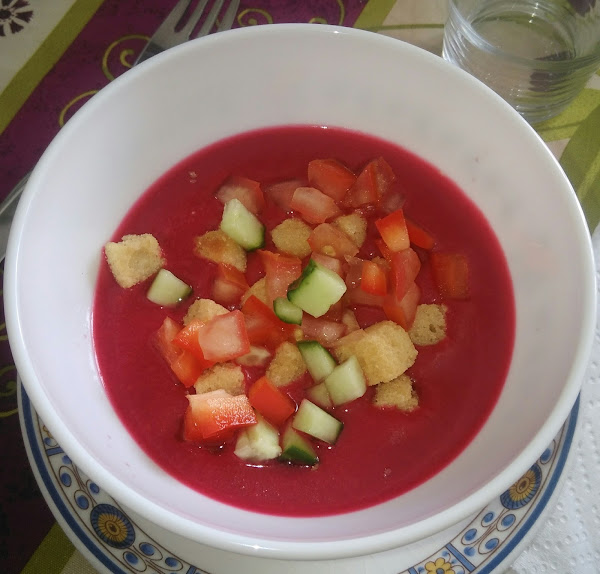500 gr de remolacha cocida,500 gr de tomates,1 pimiento grande o 2 pequeños,1 cebolla mediana,50 gr de aceite,un chorreón de vinagre,sal,10 o 12 cubitos de hieloSi quedara muy espeso añadir agua hasta que lo encontreis a vuestro gusto.