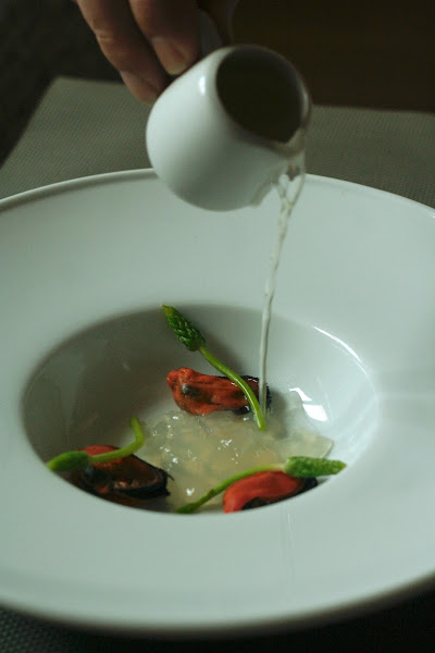 los filetes de boquerón. Verter el Gazpacho de sandía bien fría por encima y espolvorear con Albahaca picada.