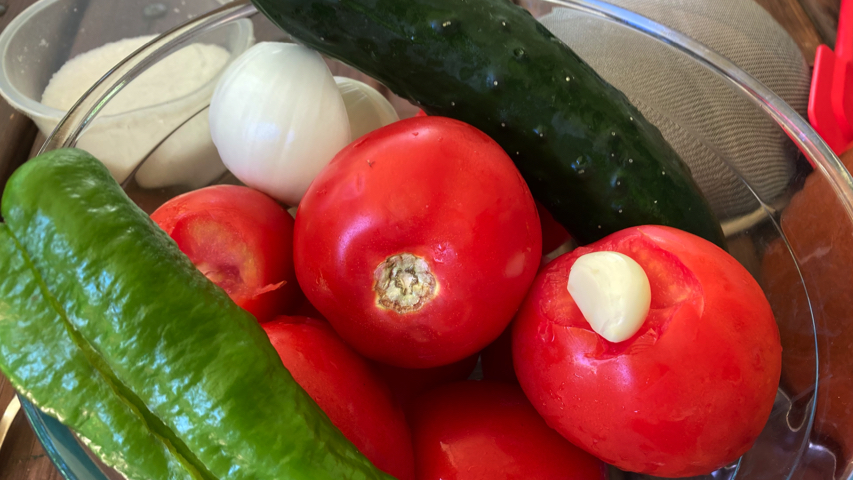 En primer lugar, cortamos y pelamos los tomates, eliminando el pedúnculo. Si te cuesta demasiado pelarlos, puedes escaldarlos rápidamente para que la piel se retire fácilmente. A continuación, colocamos este tomate en un recipiente junto con el pimiento cortado, el pepino en rodajas y el ajo sin germen.