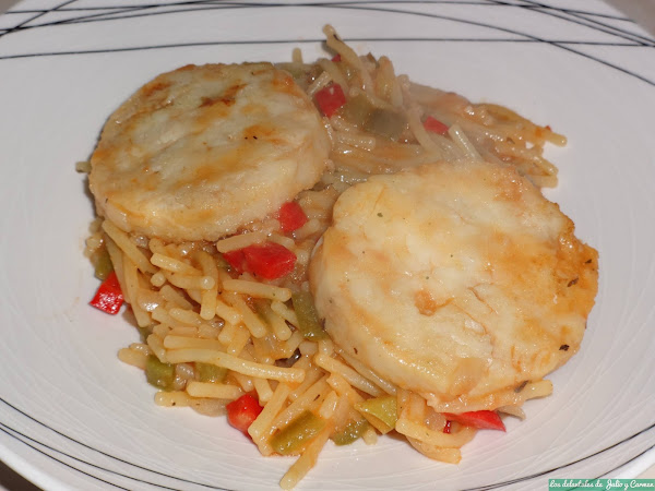 8- Cuando empiece a hervir añadimos los medallones de merluza y lo dejamos que se hagan, luego lo sacamos, reservamos y dejamos que se hagan los fideos.