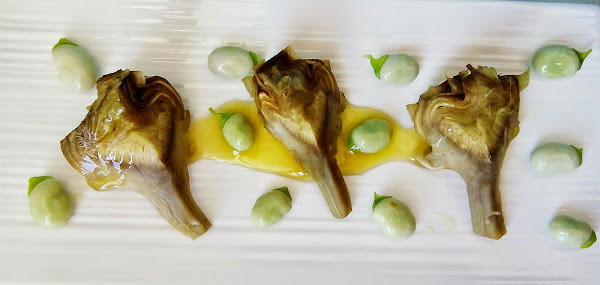 Pelar las habas quitándole los nervios de los lados y dejando algunos trozos de vainas que estén en perfecto estado, quitar las hojas más duras de las alcachofas y quitarles la punta (unos 4 cm que prácticamente quede el corazón) partirlas en cuatro trozos.