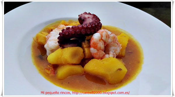 Cuando las patatas estén casi hechas añadimos el pulpo cortado en rodajas, rectificamos de sal y cocemos todo junto 5 minutos más.