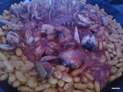 Cuando ya la salsa está lista ,colocamos en una fuente o paellera las habas y encima le echamos la salsa de las almejas...listo y buen provecho.