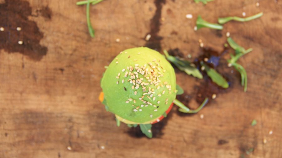 3. Se echa un poco de aceite y otro poco de sal sobre la base (si se quiere echar ketchup, se puede aprovechar el hueco de la pepita para echarlo ahí). Encima se pone la hamburguesa, que ya estará hecha, sobre ella una loncha de queso (el cheddar funciona muy bien por el color), sobre la loncha de queso se pone una tira de tomate y otra de cebolla, después un poco de rúcula y, para finalizar, un poco de mostaza o de mayonesa. Se tapa todo con la otra parte del aguacate y se adorna con unas semillas de sésamo.