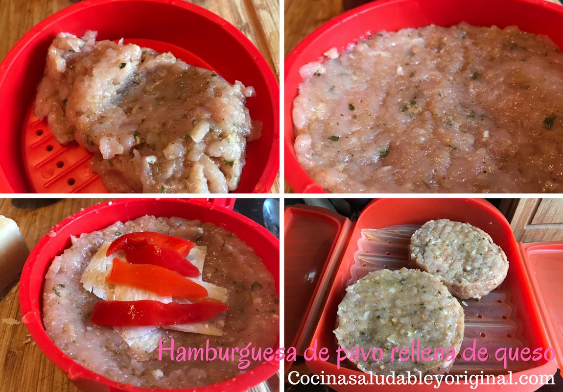 Receta de hamburguesas caseras de pavo rellenas con queso parmesano y pimientas. Receta sana al horno.