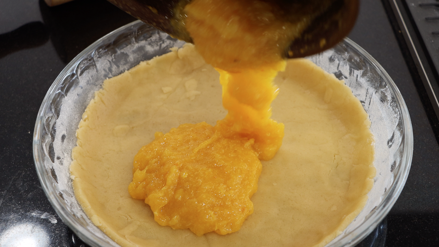 3. Engrasar un molde con mantequilla y espolvorear con harina. Estirar la masa del frigorífico y ponerla en un molde, formando los bordes. Repartimos el relleno. Por encima rallar un trozo de masa del congelador en un rallador grueso. Hornea a 180 g hasta que se dore.
