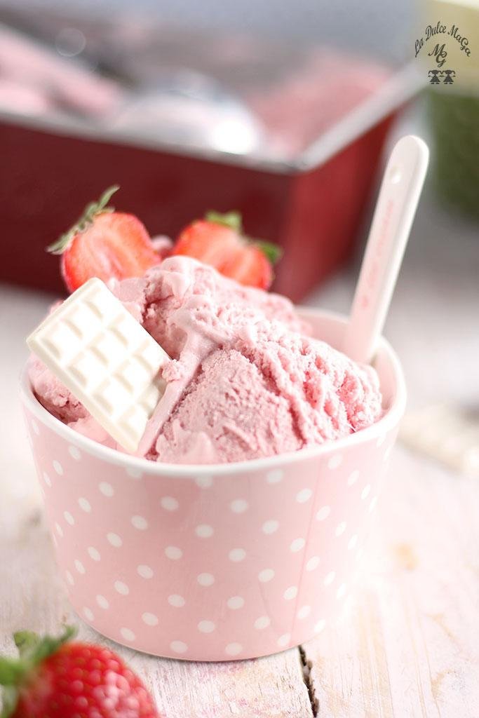 4.- Una vez listo llevamos a la heladera (que previamente habremos preparado, es decir, congelado la cubeta 24 horas o según indicación del fabricante) durante unos 30 minutos o hasta que tenga la consistencia que nos guste. Si queréis hacerlo aún más rico, podéis añadir a mitad de proceso unos trocitos de fresa bien picaditos, pero siempre con la máquina funcionando y una vez lleve al menos 15 minutos de elaboración. Una vez listo nuestro helado vertemos en un recipiente apto para congelador y congelamos durante al menos 3 horas. Una vez pasado el tiempo ya tendremos nuestro helado listo para comer.