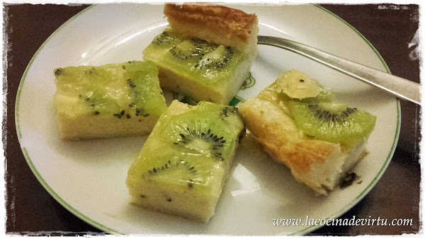 Extendemos la nata sobre el hojaldre, sobre la nata colocamos las cerezas y kiwis, después adornamos con el chocolate dejando caer un hilillos sobre la tarta, dejar enfriar en el frigorífico antes de servir.
