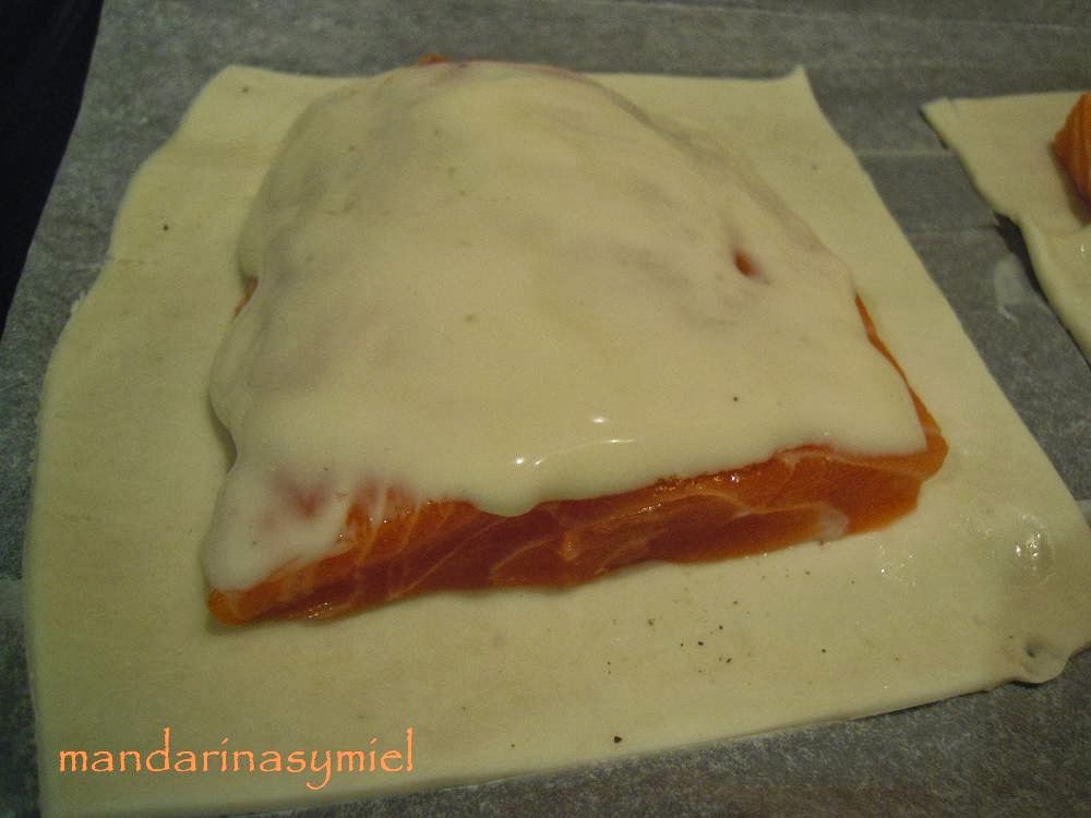 Tapa con otra pieza de hojaldre del mismo tamaño, si no tienes bastante de la masa entera, amasa los sobrantes que has cortado, extiéndelo con el rodillo y haces otra pieza igual a la del salmón. Ponla encima del salmón con bechamel y une los bordes, que se pegarán al estar mojados.
