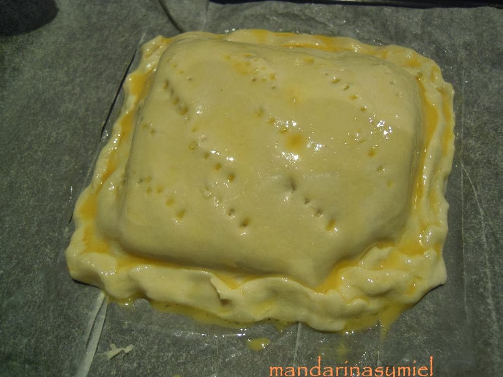 Moja con agua los lados de hojaldre que sobresalen para que se una bien después con la pieza de arriba.