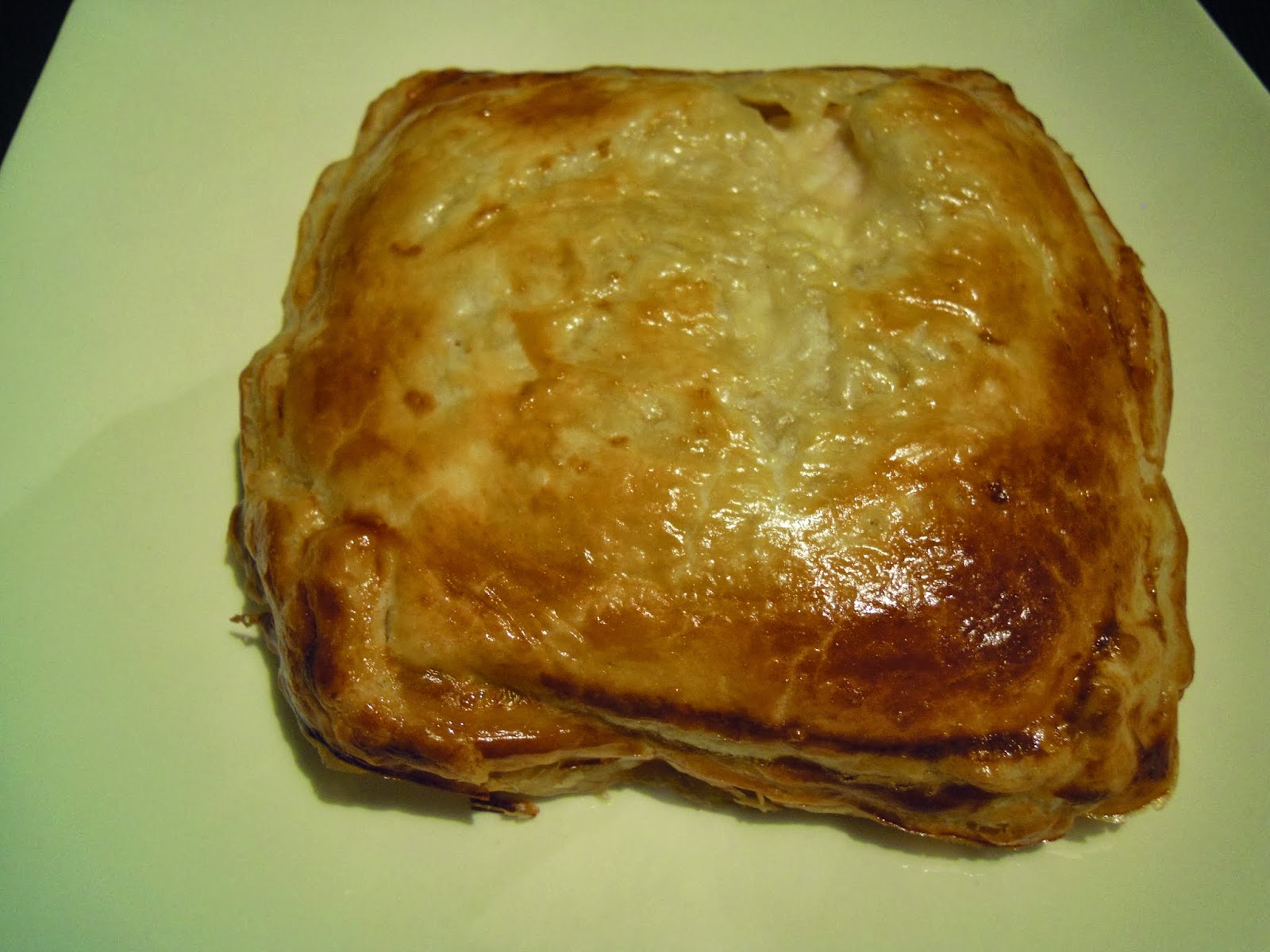 Enciende el horno a 180º ( arriba y abajo). Extiende la lámina de hojaldre sobre el papel de hornear y ponla en la bandeja del horno. Coloca el salmón en un lado del hojaldre, deja que sobresalgan unos 2 centímetros de la masa alrededor del salmón, por todos los lados y corta lo que sobre.