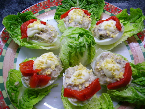 Picamos bien el resto de ingredientes ¡¡menos los pimientos rojos.... ,En un plato echamos los ingredientes que iremos mezclado con mayonesa, procediendo con el resultado de la misma a rellenar los huevos.....