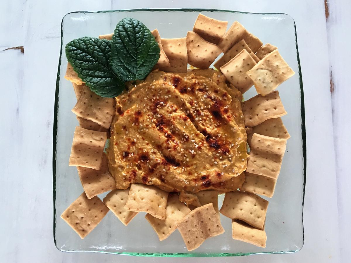 Paso 3: Pon el Hummus en un plato y ponle por encima un poco de pimentón, semillas de sésamo, un chorrito de aceite y ya estará listo para comer.