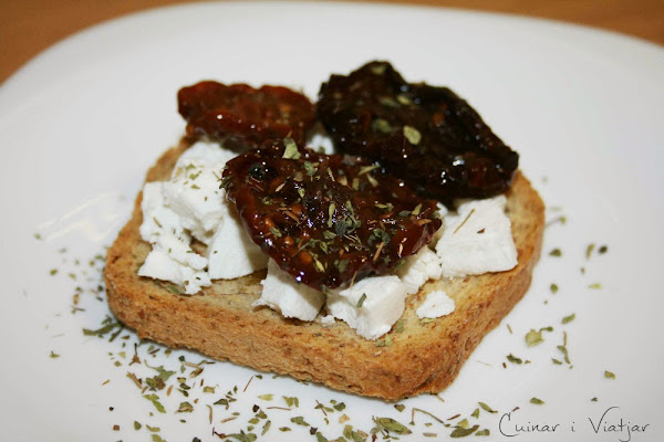 Primero cortamos la baguette en rebanadas gruesas, yo las he cortado en diagonal porque así hay más superficie para rellenar. Las pincelamos con aceite y les damos un toque de sal y pimienta. Las tostamos en el grill del horno a unos 180ºC unos minutos, y estad atentos que se queman muy fácilmente. En una picadora, echamos el pimiento, el tomate y las aceitunas, hasta que esté bien picadito, añadimos sal, pimienta, perejil picado y un toque de cayena. Reservamos. Por otro lado cogemos el queso de cabra y lo colocamos en una placa resistente al calor. Cogemos el soplete y lo tostamos (también podemos añadirle un poco de azúcar, para que caramelice), también reservamos. Cogemos el mortero y machacamos unos pocos pistachos con una pizca de sal. Hecho todo esto, montamos la tosta. Colocamos el pan y lo untamos con la salsa, colocamos el queso de cabra y por encima los pistachos machacados. Terminamos con un toque que crema de vinagre balsámico.
