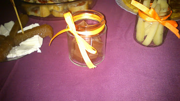 Una idea es comprar lacitos naranja, coger tarros y rodearlos con el lazo, y dentro meter tiras de queso, chocolate o alguna chuche. Y el resto lo decoramos con calabazas de cartulina, podemos pegarlas en jarras y botellas.