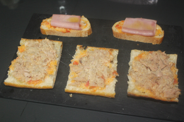 De nuevo hay que comprar pan, poner sobre él tiras de pimiento envasado, el que nos guste, cubrir con unas lonchas de queso y calentar para que éste se funda. El resultado es muy rico.