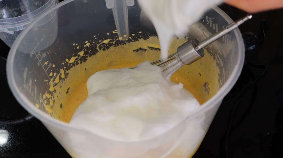 1. Separar las claras de las yemas. Añadir sal a las claras y batir hasta que aparece espuma. Añadir poco a poco azúcar, cada vez montando muy bien. Hay que añadir mitad de todo el azucar. Otra mitad de azúcar añadir a las yemas y batir. Añadir las claras a las yemas y mezclar de abajo hacia arriba. Añadir aceite, kefir y miel y mezclar. Ingredientes secos (harina, almidón, cacao y levadura ) colar y añadir a otras ingredientes. Colocar en una bandeja con papel. Distribuir y hornear 8-9 minutos 200 grados.