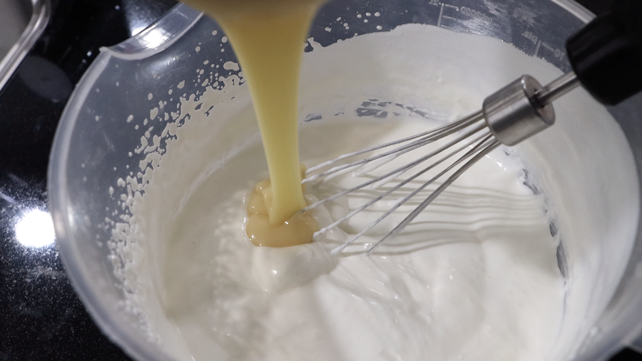 2. Para la crema montar la nata fría. Cuando se espese un poco añadir leche condensada y montar otra vez. Añadir miel y montar.
