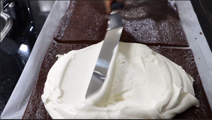 3 hojas de gelatina poner en el agua, escurrir y calentar en microondas hasta que se derrite. Cuando se enfríe añadir a la nata. 3. Cortar los márgenes de bizcocho y dividirlo en 2 partes iguales. En una parte colocar la crema. Distribuir. Cubrir con otra parte. Cubrir con paquete y dejar en la nevera para 1 noche. Después cortar en las raciones. Si quiere se puede cubrir con chocolate.