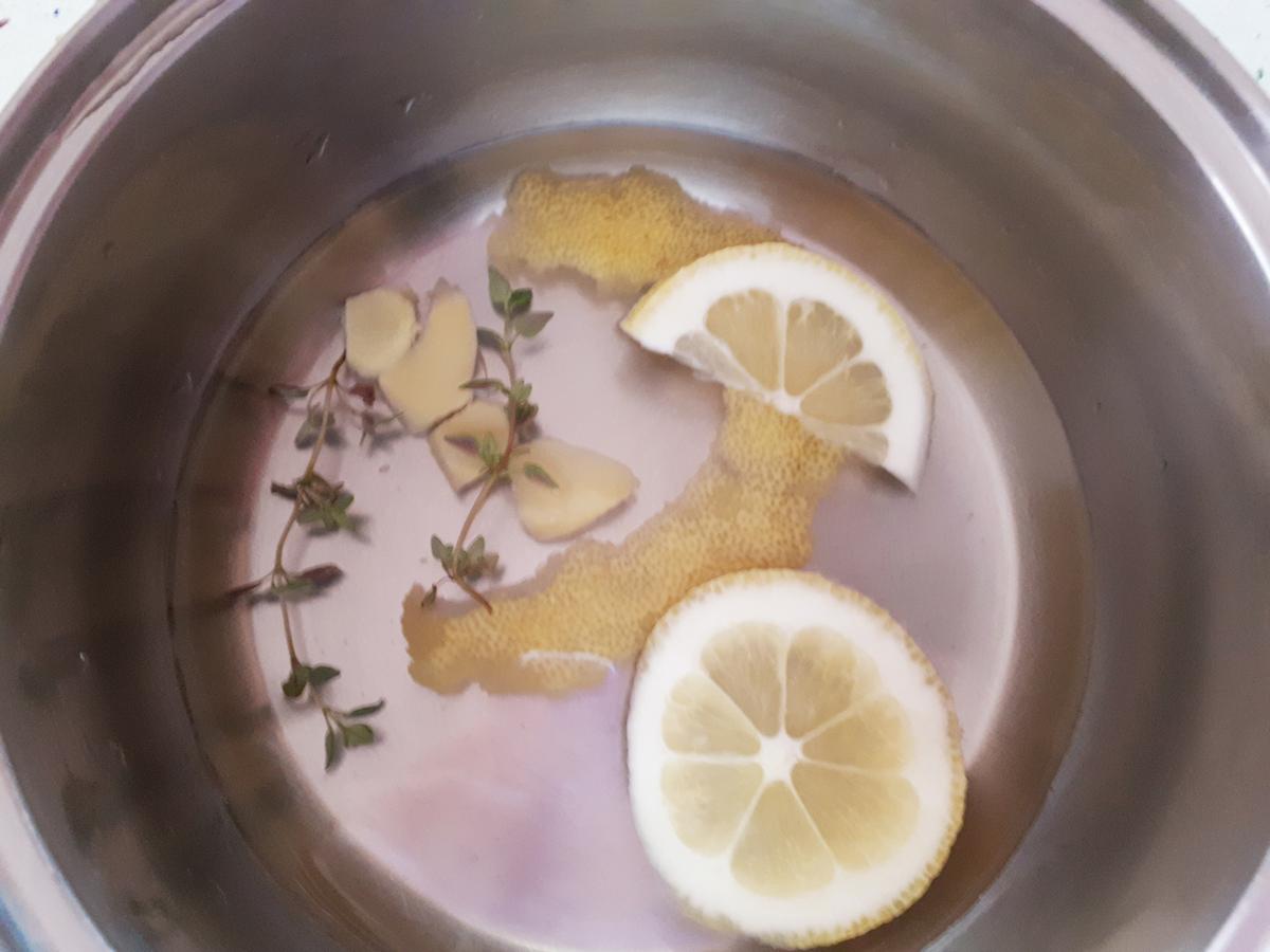Preparación: Calentamos el agua en un cazo y cuando comience a hervir retiramos del fuego y ponemos las rodajitas de jengibre previamente peladas y lavadas; el tomillo y varias rueditas de limón (previamente lavado). Dejamos reposar un mínimo de media hora. A la hora de servirlo le añadimos una cucharadita de miel (puede sustituirse por azúcar moreno, blanca, panela u otro edulcorante).