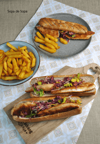 ¡¡Os traigo el capricho del fin de semana!! Unos estupendos sándwiches rellenos de escalope de pollo, con variado de coles, zanahoria y lechuga, para darle ese frescor a todo el conjunto. ¡No me digáis que no es una maravilla!Por aquí de repente han bajado las temperaturas brutalmente, así, que lo que mas apetece es quedarse en casa, sofá, peli y bocata jejeDe estos sándwiches hay muchas versiones ...