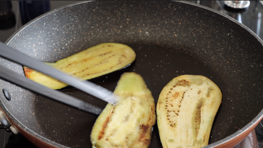 1. Cortar las berenjenas en laminas de 3-4 mm de grosor y freír hasta que estén doradas por ambos lados.