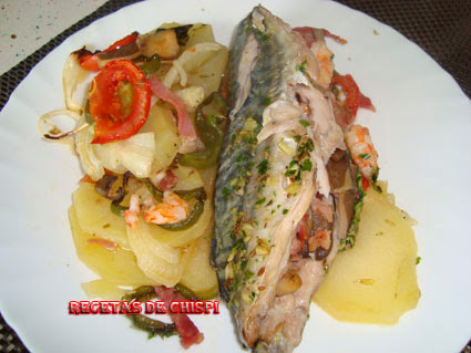 Se colocan en una bandeja de horno las patatas y la caballa con el vino,el ajo y el perejil por encima, y 10 - 15 minutos al horno.