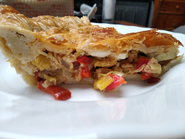 Preparamos la masa de hojaldre en la bandeja del horno y echamos la mezcla. Tapamos con la otra lamina de la masa de hojaldre, al cerrarla unimos con un tenedor, hay que tener cuidado con que los bordes no queden muy gruesos como me ha pasado a mí, y echamos un huevo batido por encima. Picamos con un tenedor para que la masa no se hinche y la metemos al horno a 180º